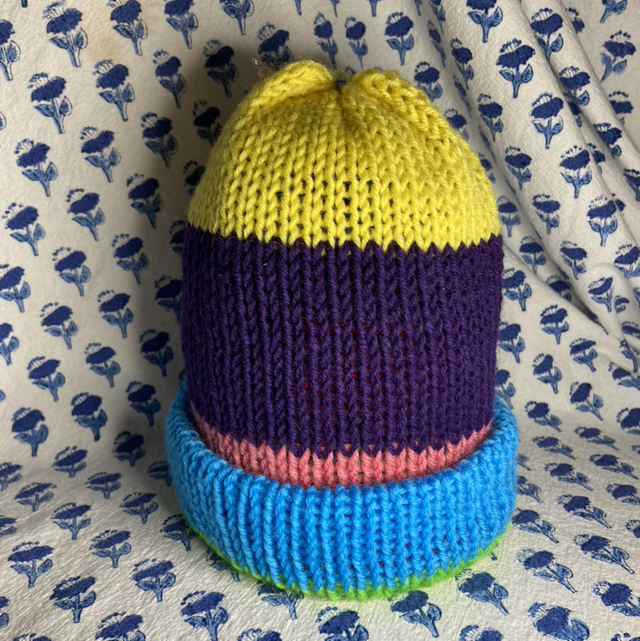 Handknit reversible beanie with thrifted acrylic yarn