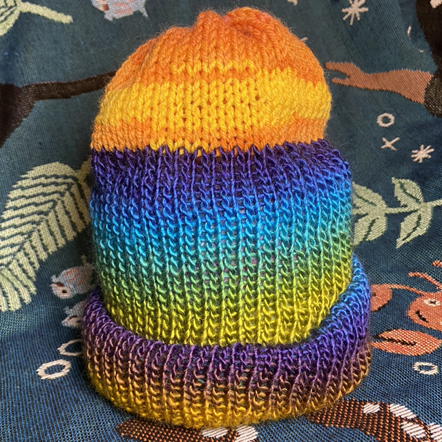 Handknit by me with acrylic yarn. Three different types of rainbow ombré in one!